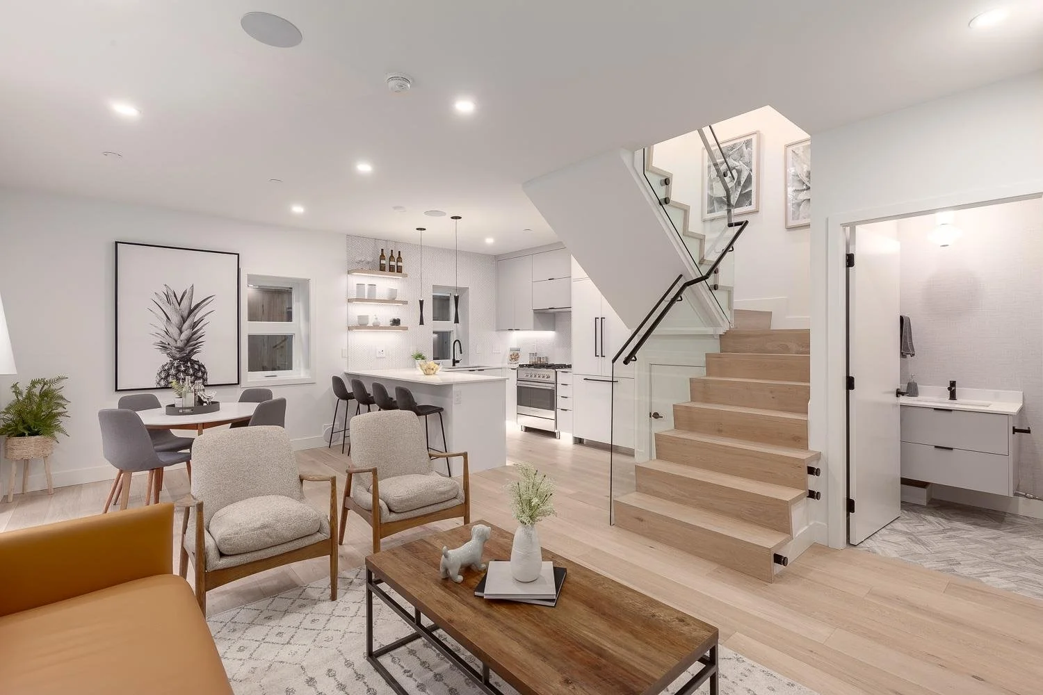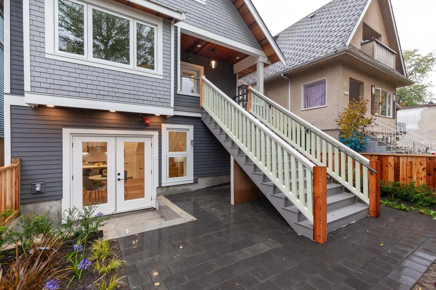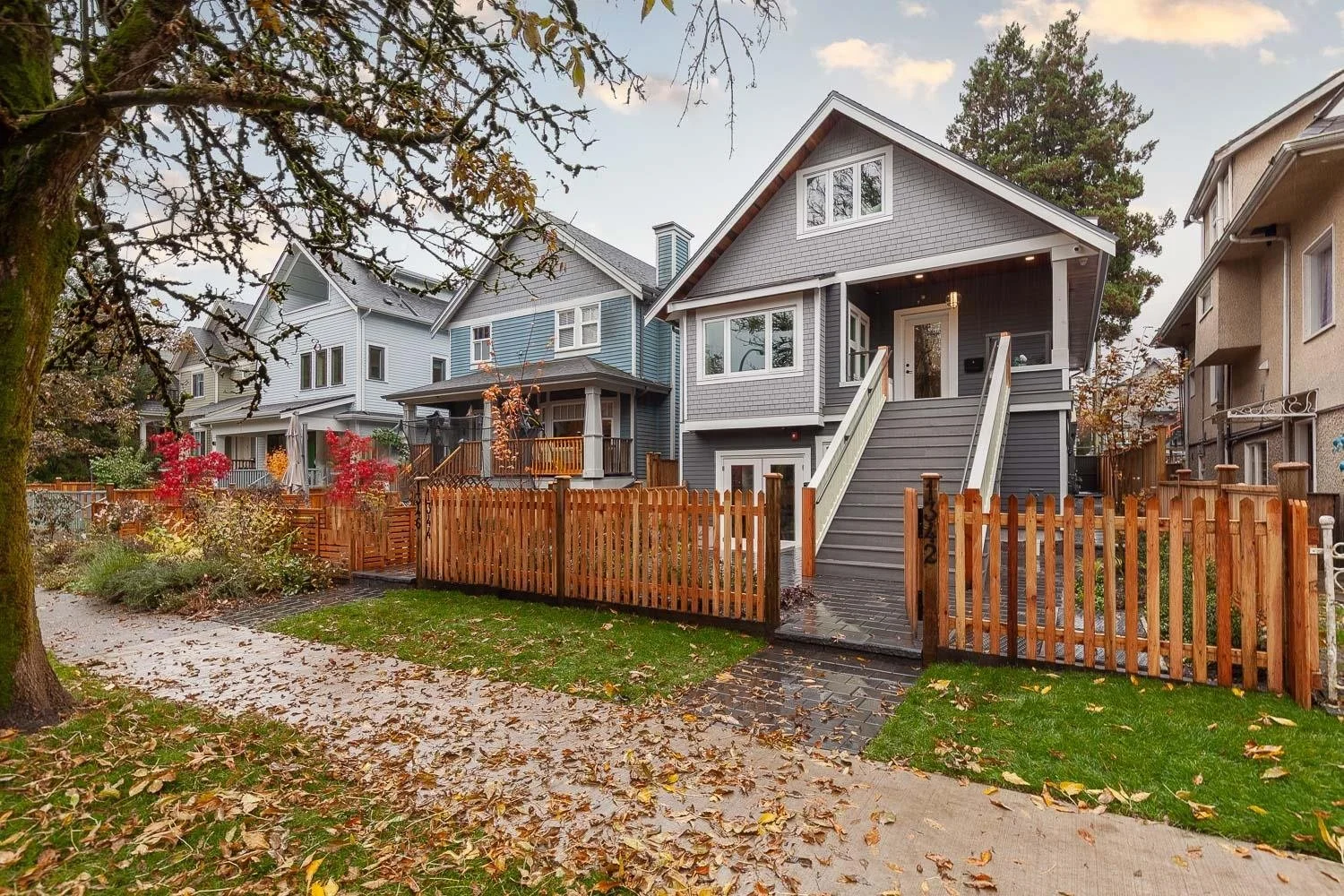 Front 1/2 Duplex in popular Cedar Cottage built by Four Corners Homes. Modern Contemporary 3 bed + 2.5 bath with custom built-ins and fixtures throughout. Step onto the spacious front veranda, a perfect space to relax. You’ll find 2 spacious, bright bedrooms, 1 bath w/ double sinks + shower tub, & washer/dryer conveniently located on Main Floor. The upper floor has the 3rd bedroom feat. a private spa-like 3pc ensuite, built-in closet space & 165 sqft of storage space, completely flexible space ideal as guest bed, playroom, or home office. Lower floor has French doors that lead to a beautiful front patio w/ an open concept, modern spacious living, dining, & kitchen that features integrated appliances w/ gas cooktop, custom white cabinetry with black hardware, & mosaic tile backsplash. Live in complete comfort with security monitor & alarm system, HRV, gas BBQ bib, & built-in speakers; perfect to entertain family & friends. Across from Cedar Cottage Park.