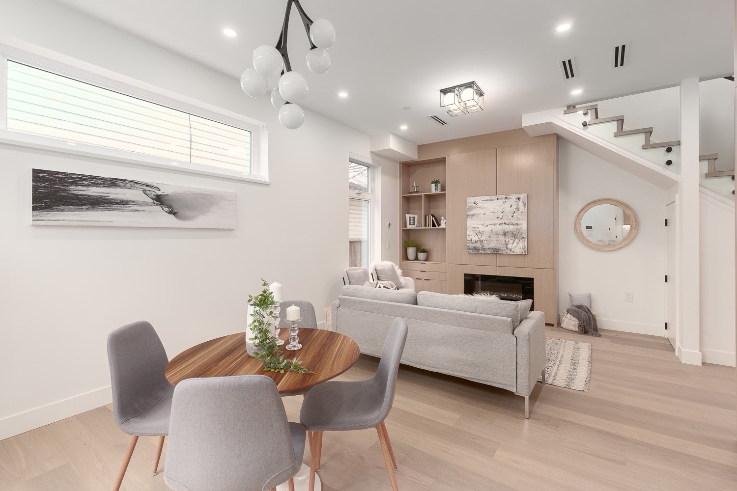 Modern, state-of-the-art back 1/2 duplex @ Wales Living. Rare offering of 9-unit, private strata, w/ intentionally crafted spaces that mix functionality w/ contemporary artistic design. Sleek, modern exterior matches extensive modern details/custom-built design of interior. Open concept M/F captures you w/ well-placed windows bringing in natural light. Kitchen has white cab, seamless millwork, integrated appl pckg-Fisher & Paykel & extensive built-ins. Wide-plank oak floor runs thru & custom glass railings on stairs. Above Main has 2 large beds, smart built-in closets, full 4-pce bath & full sized in-suite W/D w/ laundry stn. Upper has spacious 3rd bed/3-pc bath w/ ext. tiling & function as home office/family room. Four Corners/Modern Style offers the highest quality construction.